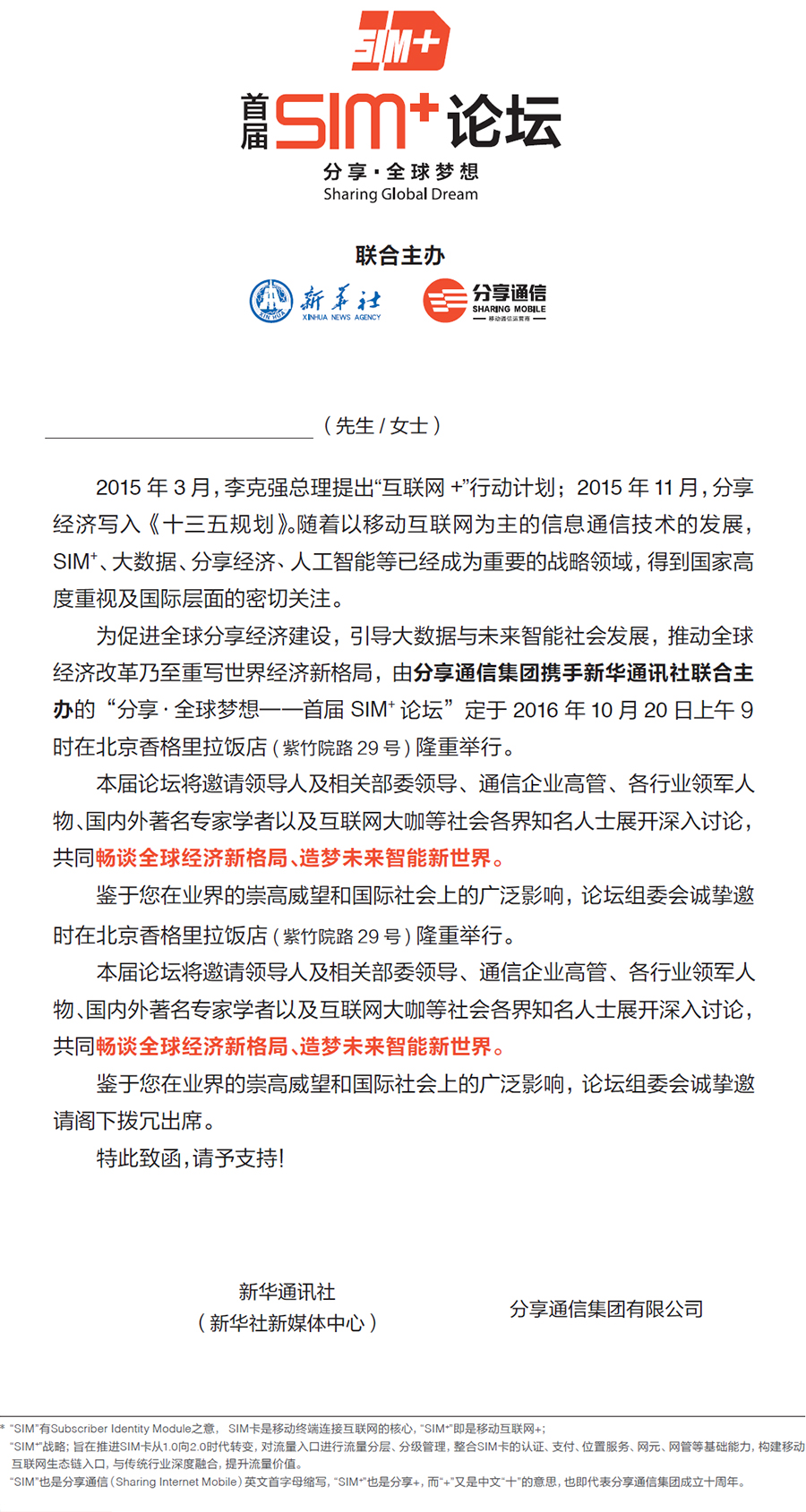 为促进全球分享经济建设,引导大数据与未来智能社会发展,推动全球经济改革乃至重写世界经济新格局,由分享通信集团携手新华通讯社联合主办的“分享·全球梦想——首届SIM+论坛”定于2016 年10 月20 日上午9 时在北京香格里拉饭店隆重举行。本次论坛将以“分享·全球梦想”为主题,紧密围绕SIM+、分享经济、大数据、全球战略等关键词精彩展开。力求将本次论坛打造成为国内首个SIM+高端国际交流平台、全球分享经济建设的智库联盟,掀起一场全球经济改革思路的头脑风暴,由此引导大数据与智能社会的发展方向。